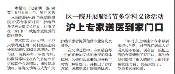 5月5日上午,吴江区第一人民医院开展“关爱肺健康 沪苏专家面对面”肺结节多学科大型义诊活动,让市民在“家门口”就能享受优质的医疗服务。