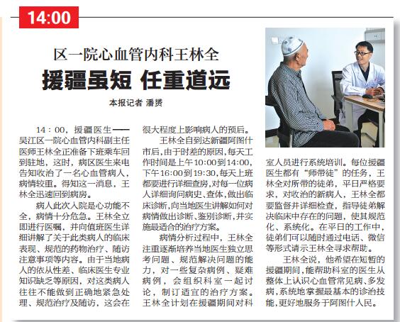 14∶00,援疆医生——吴江区一院心血管内科副主任医师王林全正准备下班乘车回到驻地,这时,病区医生来电告知收治了一名心血管病人,病情较重。得知这一消息,王林全迅速回到病房。