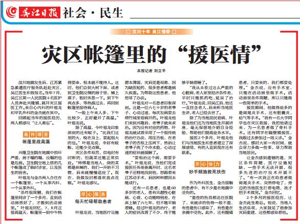 汶川地震发生后,江苏紧急派遣医疗服务队赶赴灾区,吴江医生积极报名。当年7月,吴江区第一人民医院4名医护人员奔赴兴隆镇,展开灾区援医工作。来自心内科的叶福龙和甲乳外科的金杰就在其中。