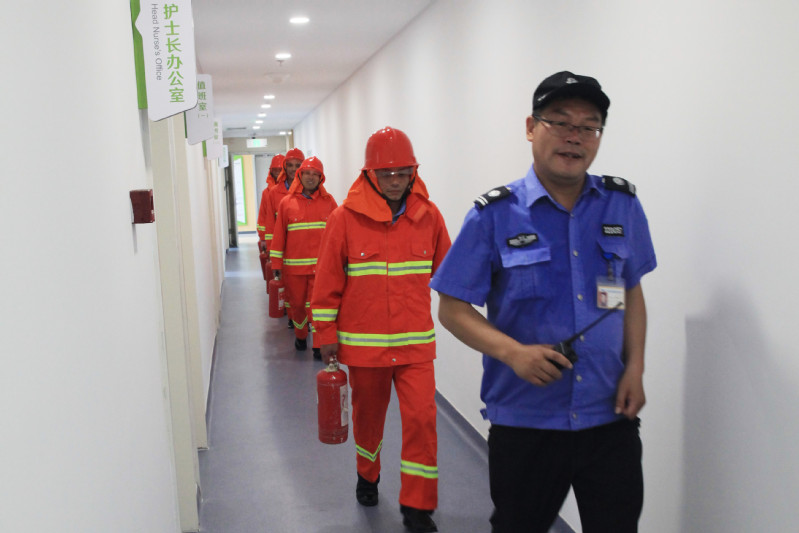 此次演练现场设在医院综合病房楼5楼。模拟病区发生火情后,科室第一时间采取处置措施启动火灾应急预案,按照火灾处置流程,有条不紊进行疏散、救援。同时科室拨打报警电话,向医院消防控制室报告火情;消防控制室值班人员接到火情报告后,迅速用对讲机进行汇报、启动安保人员和医院微型消防站人员,赶赴火灾现场参与救援,火势第一时间扑灭。