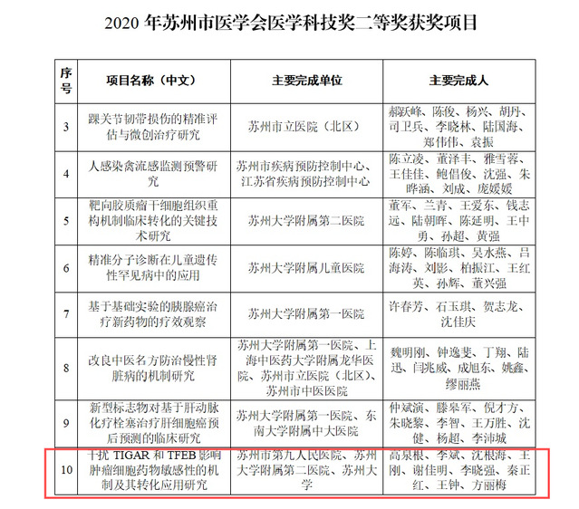 普外科团队申报的“干扰TIGAR和TFEB影响肿瘤细胞药物敏感性的机制及其转化应用研究”项目,喜获苏州市医学会医学科技奖二等奖。