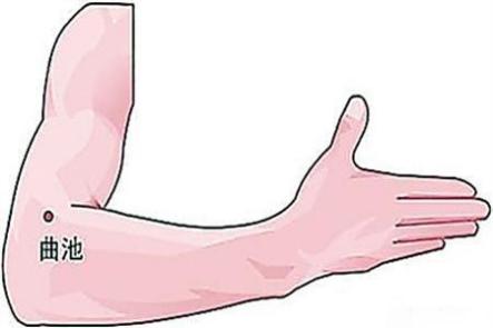 按揉曲池:(取穴肘横纹外侧端,屈肘,当尺泽与肱骨外上髁连线中点):一手拇指置于另一侧曲池穴,稍用力按揉使局部酸胀。有清热祛湿的作用。