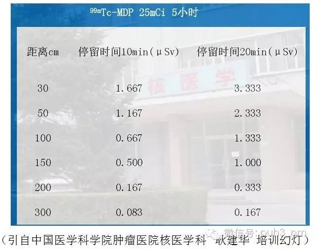 同样以目前用药量相对较大的全身骨显像为例。患者注射25mci骨显像剂后2-5小时进行显像,检查结束后以不同的距离、固定时间测定其对周围的辐射剂量(见下图,数据来源于中华医学会核医学分会),可以看出在距患者10cm的距离,接触患者10分钟,需要同时接触600个患者,才能达到1mSv的公众剂量剂量限值。即使护士对于患者进行近距离操作,一般也不超过10分钟。由此可见尽管我们建议受检者在检查当要日尽量避免与婴幼儿及孕妇的密切接触,但实际上当患者检查结束之后体内的放射性水平已在相当低的水平,一般不会对与之密切接触的周围人员造成影响。