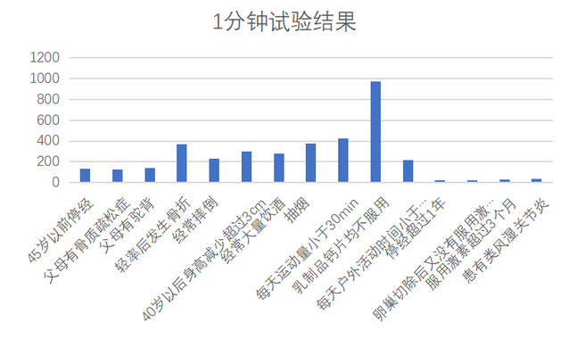 2)存在骨质疏松症的风险:有1921人成了1分钟试验筛查,阳性率达90%以上,其中每天既不食用乳制品,又没有服用钙片、发生脆性骨折、每日运动量小于30min的人数较多,存在骨质疏松症的风险较大。