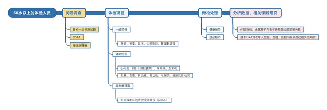 2. 研究方法:屯村社区60岁以上的3530名老人,每日安排100人次,每周3天,并对前来人员登记排号并完成骨质疏松“1分钟试验”的筛查,然后安排体检,包括:1)一般项目:身高、体重、血压、心肺听诊、腹部触诊等常规体格检查。2)辅助检查:心电图、B超(肝胆胰脾)、尿常规、血常规、血糖、血脂、肝功能、肾功能、电解质、癌胚抗原检测。3)骨密度检测:外周双能X-线骨密度测量仪(pDXA)。对患者pDXA的结果做出诊断,并对骨质疏松患者进行患教及治疗。最后做好资料统计工作,逐年进行比较,及时发现防治效果及存在的问题。
