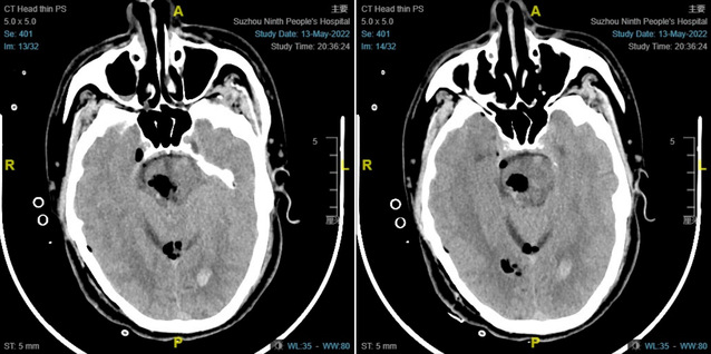 5月13日,患者蒋某某因突发昏迷由120急送至九院急诊抢救,急诊科医生接诊后迅速判断病情:患者昏迷,左侧肢体肌张力高,考虑脑出血可能。急查CT明确:脑干出血。患者脑干出血量大,严重危及生命。神经外科医师接到急会诊通知后迅速到场,并将患者收入神经重症监护病房行进一步诊治。