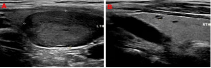 99mTc-MIBI甲状旁腺SPECT/CT融合显像图:图1+2冠状位、图3+4矢状位、图5+6横断位,提示功能亢进甲状旁腺组织(十字线交叉处)。随后的超声提示:双侧甲状旁腺区多断面超声扫查未见明显异常占位性病变;双侧甲状腺结节,其中左侧叶内一枚33mm×19mm低回声、边缘光滑、内无强回声结节。颈部B超图:A、B(纵切面)分别显示甲状腺左叶、甲状腺右叶;左叶内一低回声结节。