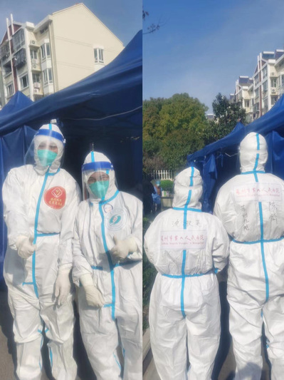 一个小时左右我们到达了目的地:中华园小学。志愿者们已经早早地等候在那里了。这时候天微微亮,她们手里捧着花,期盼的眼神中又透露着焦急和疲惫。快速的进行了简单的交接仪式后,当地的负责人就安排我们去了不同的采集点位。我和我老婆的点位是陆家镇的春江佳苑小区,小区很大分南北区。仓促地吃了几个包子(怕中午饿吃的多,怕上厕所就尽量不喝液体),就开始穿防护服。时间有限,这次的任务很重。