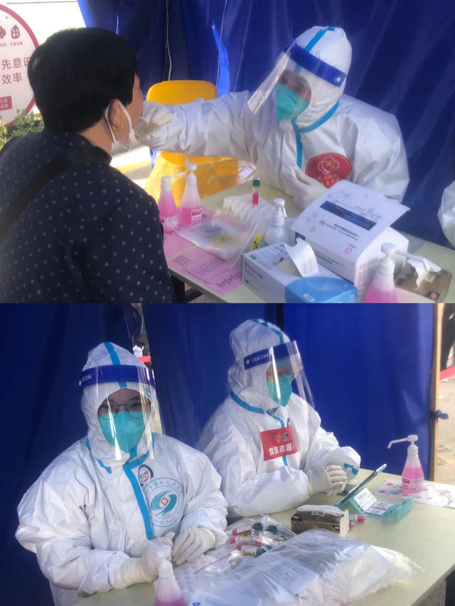 采样的过程是比较机械和枯燥的,但我们都显着很有耐心。偶尔会出现一些小问题影响采集速度,比如和我分在一起的志愿者刚接触系统,碰到系统卡死或者拍照没反应,我会教她怎么做。有时候时间久了手和腰背会酸痛,大家就会自嘲自己是流水线的工人,但其实我们心底都明白这份戏谑后面是强大的责任感与使命感。封箱的空隙,当地的采样医护人员知道我们是“夫妻档”,就一定要给我们拍张合照。这张合照我想以后一定会成为宝贵的回忆的吧,也想给两个儿子树立一个榜样:父母不是不爱你们,不陪你们,而是践行着“先有国后有家”、“舍小家为大家”这样的价值观,以后你们要成为一个有责任有担当的人。在不停的工作中,时间过得很快。接近晌午,村书记宣布结束小区采样工作。