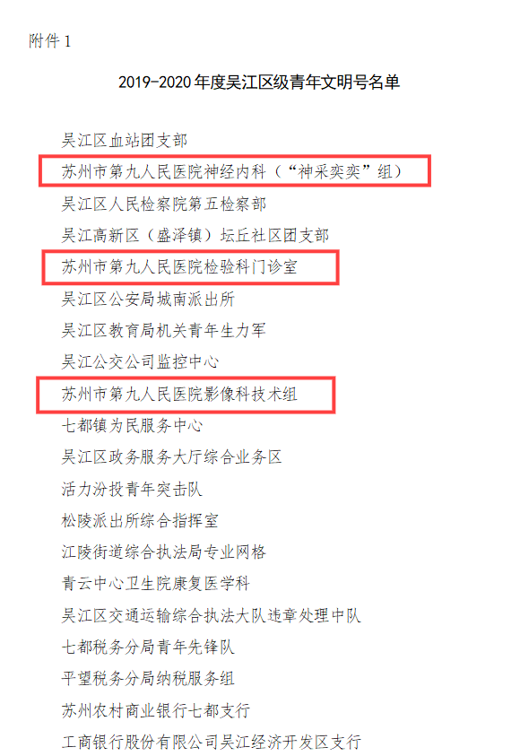 神经内科(“神采奕奕”组)、检验科门诊室、影像科技术组与其它22家青年集体被命名为2019-2020年度吴江区级青年文明号。
