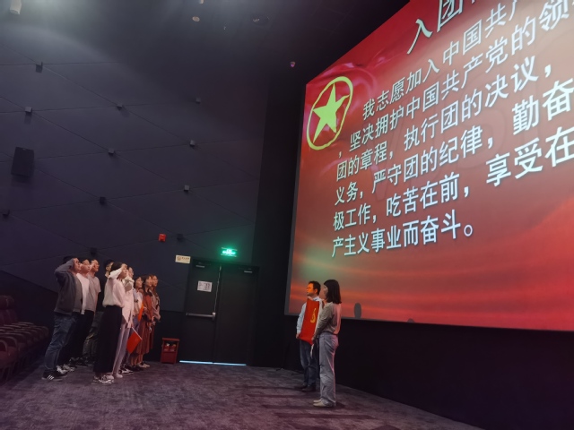 在观影活动之前,全体团干部、团员青年面向团旗,高举右拳,重温入团誓词,大家一致表示要深入开展党史学习教育,庚续中国共产党人百年精神谱系,不断凝聚前行力量,推动事业发展,切实把学习成效转化为工作动力和工作成效。