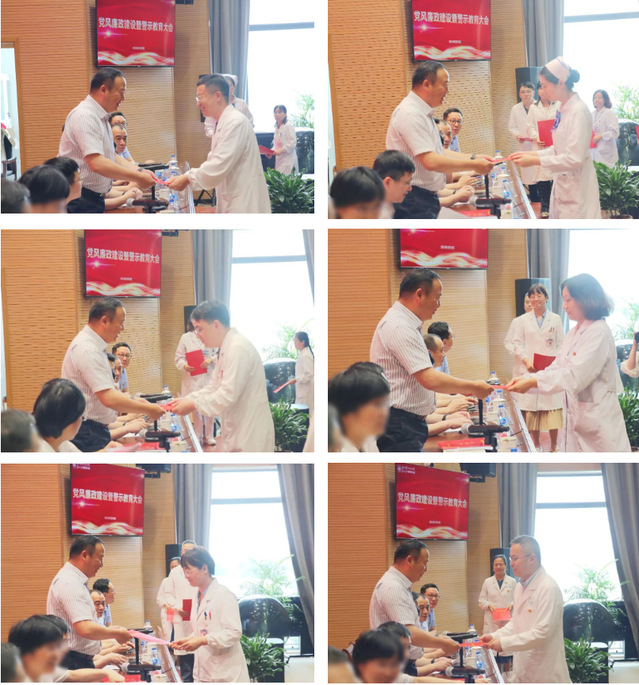 会上,医院各党总支书记递交党风廉政建设责任书,全体人员观看警示教育片。