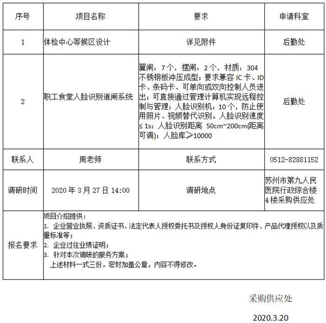 体检中心等候区设计、职工食堂道闸安装项目调研通知