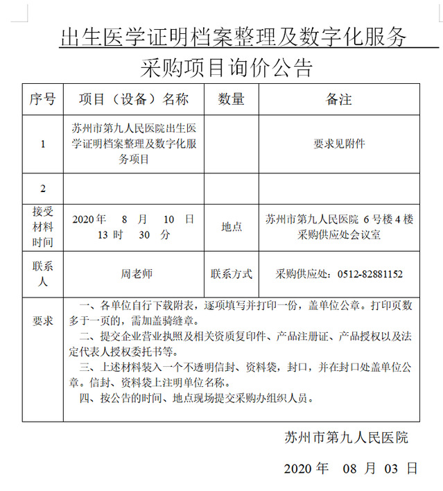 出生医学证明档案整理及数字化服务采购项目询价公告
