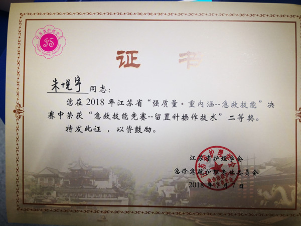 7月7日,江苏省“强质量-重内涵-急救技能决赛”在南京鼓楼医院盛大举行,来自全省各家医院选拔出的44名优秀护理人员参加决赛。吴江区一院选派的护士朱悦宇经过激烈角逐,*终取得留置针操作项目二等奖的优异成绩。