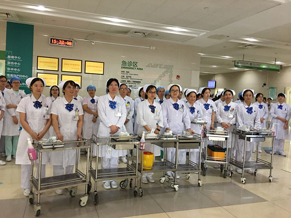 只见五六分钟的时间,在医院各病区的应急护理人员,按要求带着相关急救物品器械,快速来到了急诊大厅待命,听从现场指挥的安排。