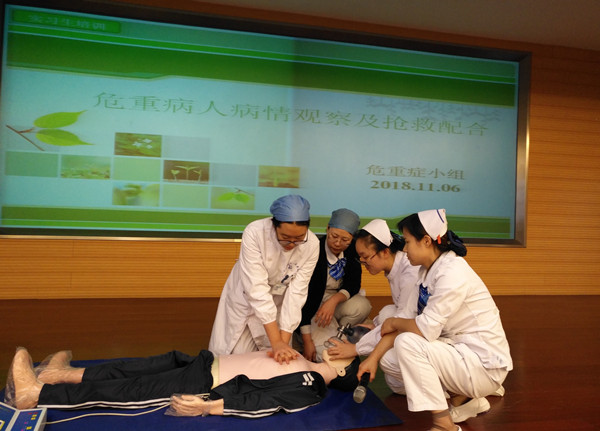 为提高实习生对危重病人病情观察的能力,提升护理急救水平,11月上旬,吴江区一院组织实习生危重症知识及技能培训。危重症专科护理组ICU护士长李莉进行授课,急诊科护士长黄玉凤配合进行现场演练,全院共有100余名实习生参加了培训。