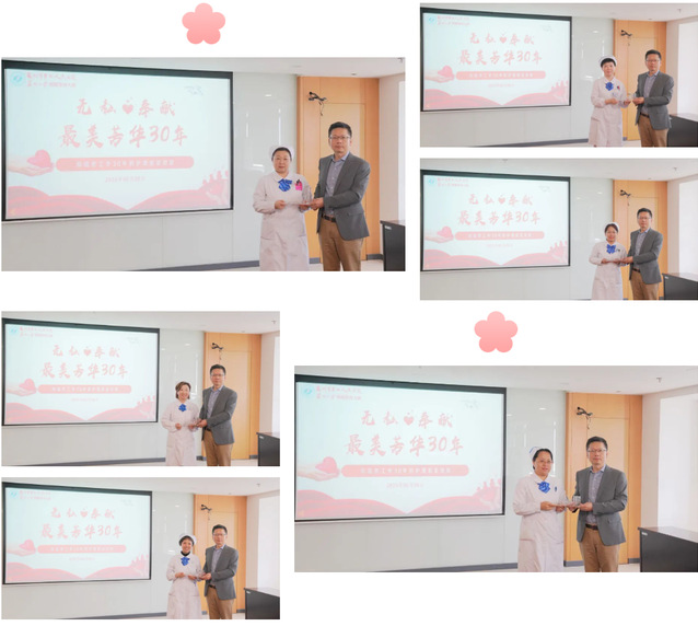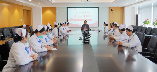 活动最后,副院长张群雄引用冰心老人的一段话对三十年以上护士的爱与奉献做出了最好的诠释:“爱在左,同情在右,走在生命之路的两旁,随时撒种,随时开花,将这一径长途,点缀得花香烂漫,使穿枝拂叶的行人,踏着荆棘,不觉疼痛,有泪可落,却不是悲凉”。