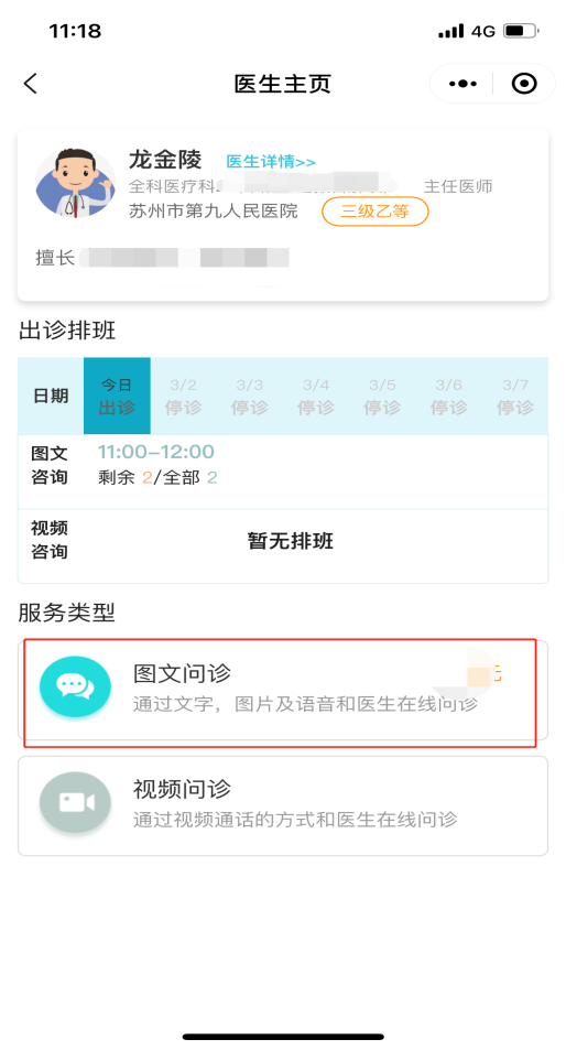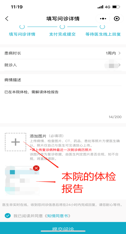 4.选择【全科医疗科】及选择有号源医生后点击【图文问诊】,患者需填写情况,并上传体检报告。