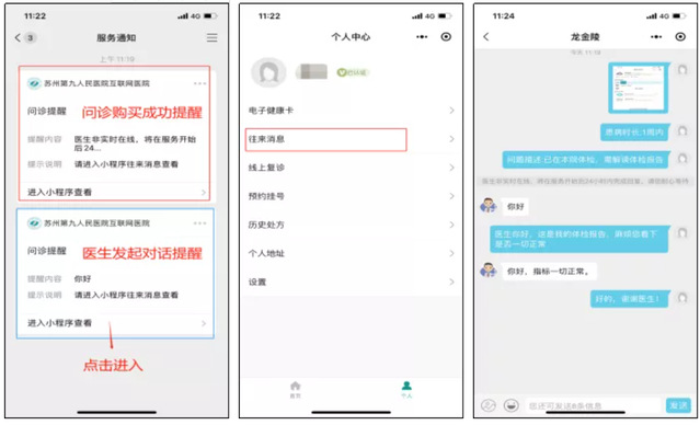 5.问诊服务购买后,患者将等待医生发起会话,医生发送消息给患者时,在微信的【服务通知】中患者将收到消息提醒,点击【进入小程序查看】,点击【往来消息】进入问诊聊天页面。