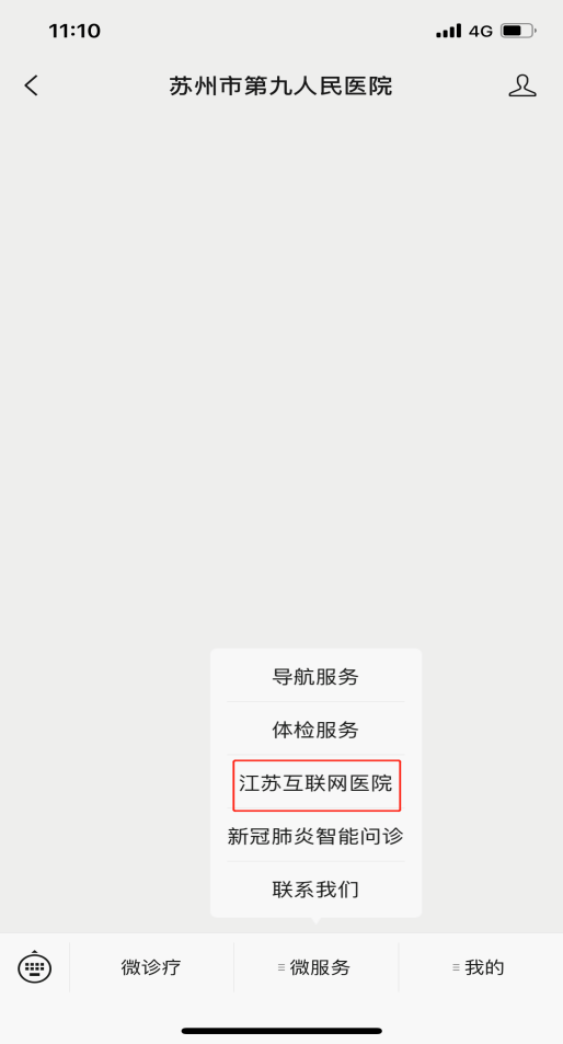 2.进入公众号后,在【微服务】菜单中,选择【江苏互联网医院】。