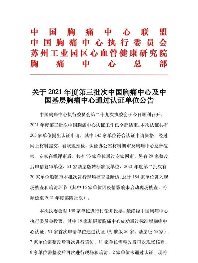 近日,2021年度第三批次中国胸痛中心认证工作顺利完成。经执行委员会投票,19家基层版胸痛中心成功通过标准版胸痛中心认证,91家首次申请单位通过认证,金沙娱乐城app