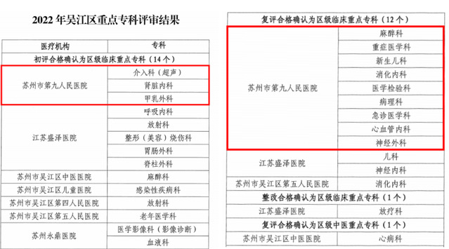 介入科(超声)、肾脏内科、甲乳外科新确认为吴江区重点专科。麻醉科、重症医学科、新生儿科、消化内科、医学检验科、病理科、急诊医学科、心血管内科、神经外科顺利通过复审,继续确认为区级重点专科。