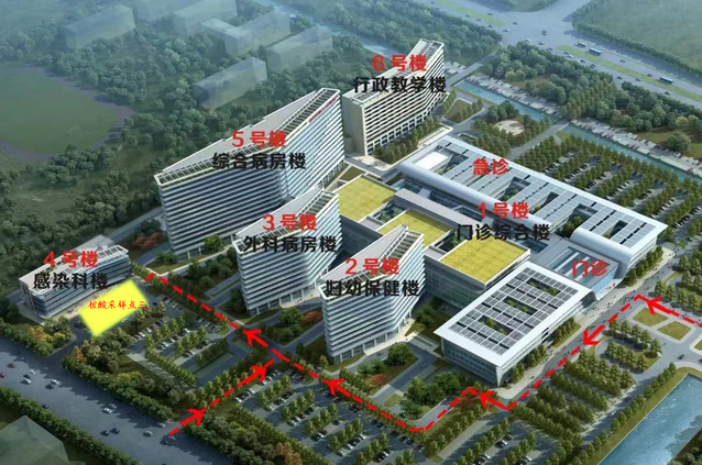 医院感染科楼(4号楼)南侧广场原社会人群愿检尽检、应检尽检采样调整至苏州湾体育中心北侧便民采样点(医院南大门马路斜对面)图中1号位置,原区域仅保留院内就诊人员采样;原黄码采样点搬迁至苏州湾体育中心东侧停车场图中2号位置。