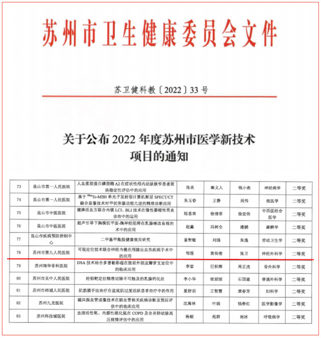 泌尿外科的“泌尿系结石的早期预防及术后管理”和心血管内科的“血管腔内影像学指导和优化经皮冠状动脉介入治疗冠心病患者的临床研究”获得苏州市临床重点病种项目立项