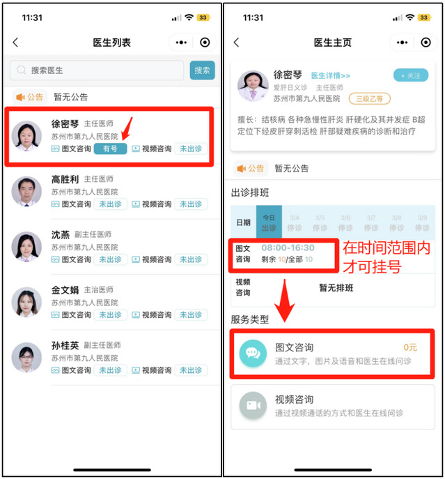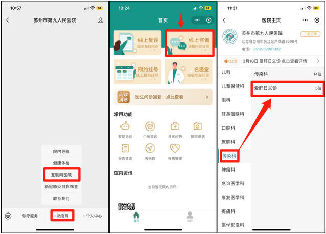 微信搜索“金沙娱乐城app ”公众号关注并打开选择“微官网”点击“互联网医院”选择“线上咨询”选择传染科---爱肝日义诊-- 医生(显示有号源)--图文咨询--填写信息提交问诊--等待医生接诊。