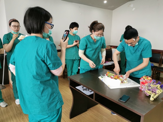 “战友”们童心未泯,为了这份惊喜,肖佩华主任早早的安排浦秦华主任陪同郑江南,报告行踪,留好暗号,等郑江南开门进来的一刹那,《有点甜》的歌声骤然响起,由管光辉主任C位领舞,大家伴着音乐律动,肖主任手捧蛋糕,唱着生日歌缓缓走入队伍,现场气氛欢快热烈。郑江南双眼湿润了,他声音有点沙哑,双手合十向大家深深鞠躬:“感谢大家为我精心的安排,让我过了一个一生难忘的生日,我感到特别幸福!能和大家一起在武汉驰援,这是不可多得的缘分,我一定好好珍惜”。
