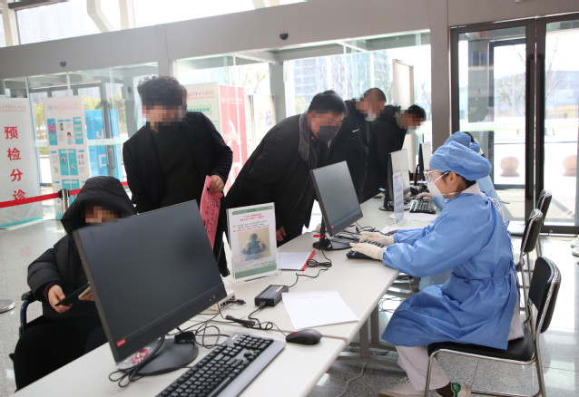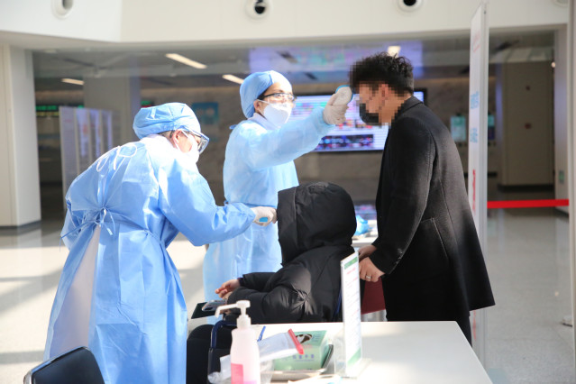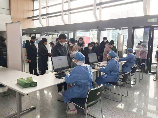 在门急诊、各住院楼出入口处,医院分别设立了预检分诊台,患者及家属必须出示有效身份证件或陪客证,通过电脑刷卡(身份证、市民卡),进行准确、快捷地身份识别,并配合完成体温检测和登记后才能入院。医院安排了志愿者组成“铜墙铁壁”,医务人员和保安24小时轮班接诊,为前来咨询、就诊的患者提供服务,切实做好筛查、检测和分诊等防控工作。